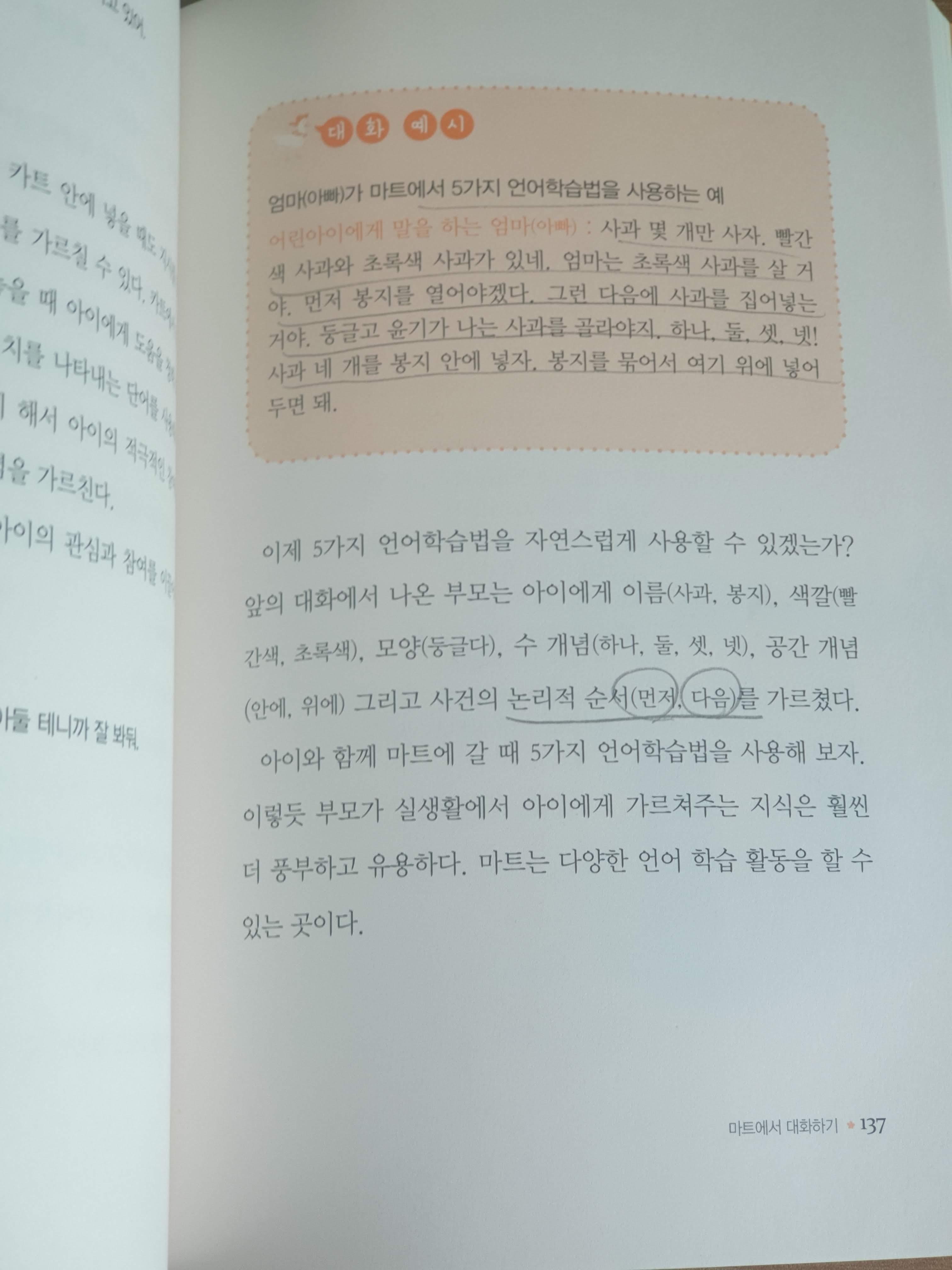 이 책대로 아이에게 말을 해준다면 아이에게 따로 학습처럼 가르칠게 전혀 없어지더라고요. 저는 요즘 36개월 영유아 검진을 준비하고 있어요. 문진표를 보며 할 수 없는 게 많아 걱정이더라고요. 특히 인지 부분에서는 따로 가르쳐야 할게 많아 보여요. 크기, 공간 개념, 성별, 숫자, 같은 종류, 수 개념 등. 아래 마트에서 대화 나누기의 예시를 보면, 대화 내용 안에 그것들이 대부분 들어가 있어요. 일상생활에서 즐겁게 대화만 잘 나누어도 가르칠 수 있는 게 많더라고요.
