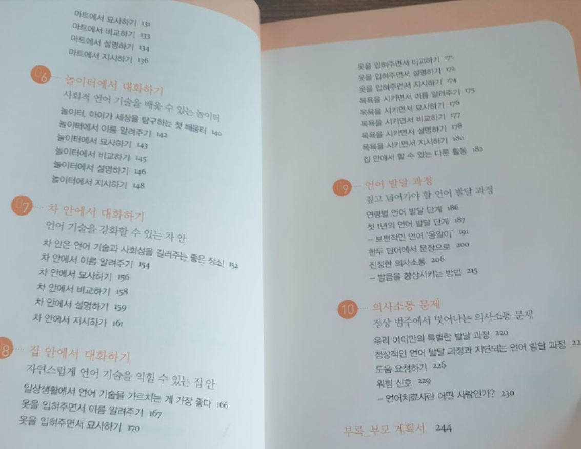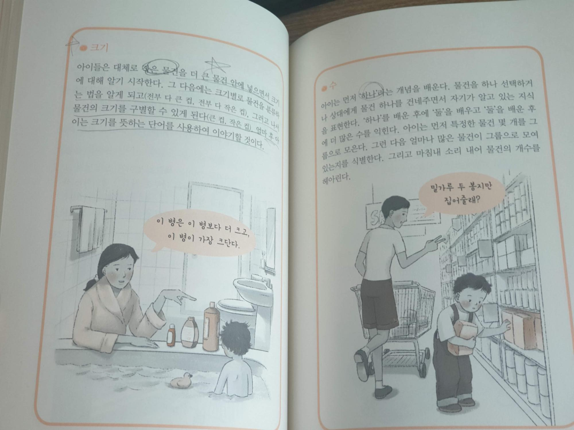 여기 언어 발달과 관련한 다른 책을 보게 되었습니다. 이전에는 아이와 상호작용, 짧은 말이라도 하게 하는 게 목표였다면 이제는 아이가 문장으로도 말하고 다양한 언어도 구사해지길 바라고 있습니다. (아직 말이 안트여서.. 할 수 있을지는?..)