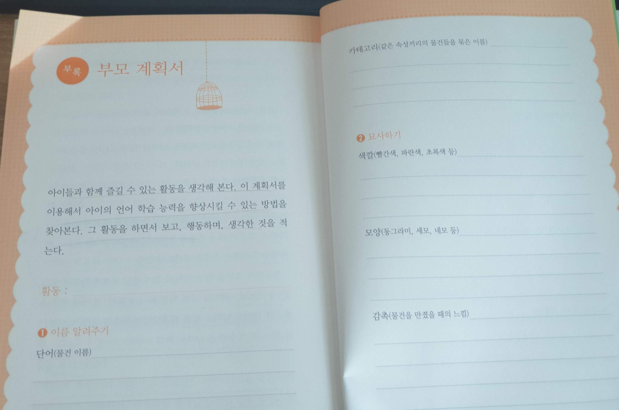 이 책에서 말하는 기본 원칙은 말하기 안에 묘사하기, 비교하기, 설명하기, 지시하기가 다 들어가도록 말을 해주라는 것입니다. 이렇게 맨 마지막에는 엄마가 연습할 수 있도록 '부모 계획서'라는 것도 있어요.