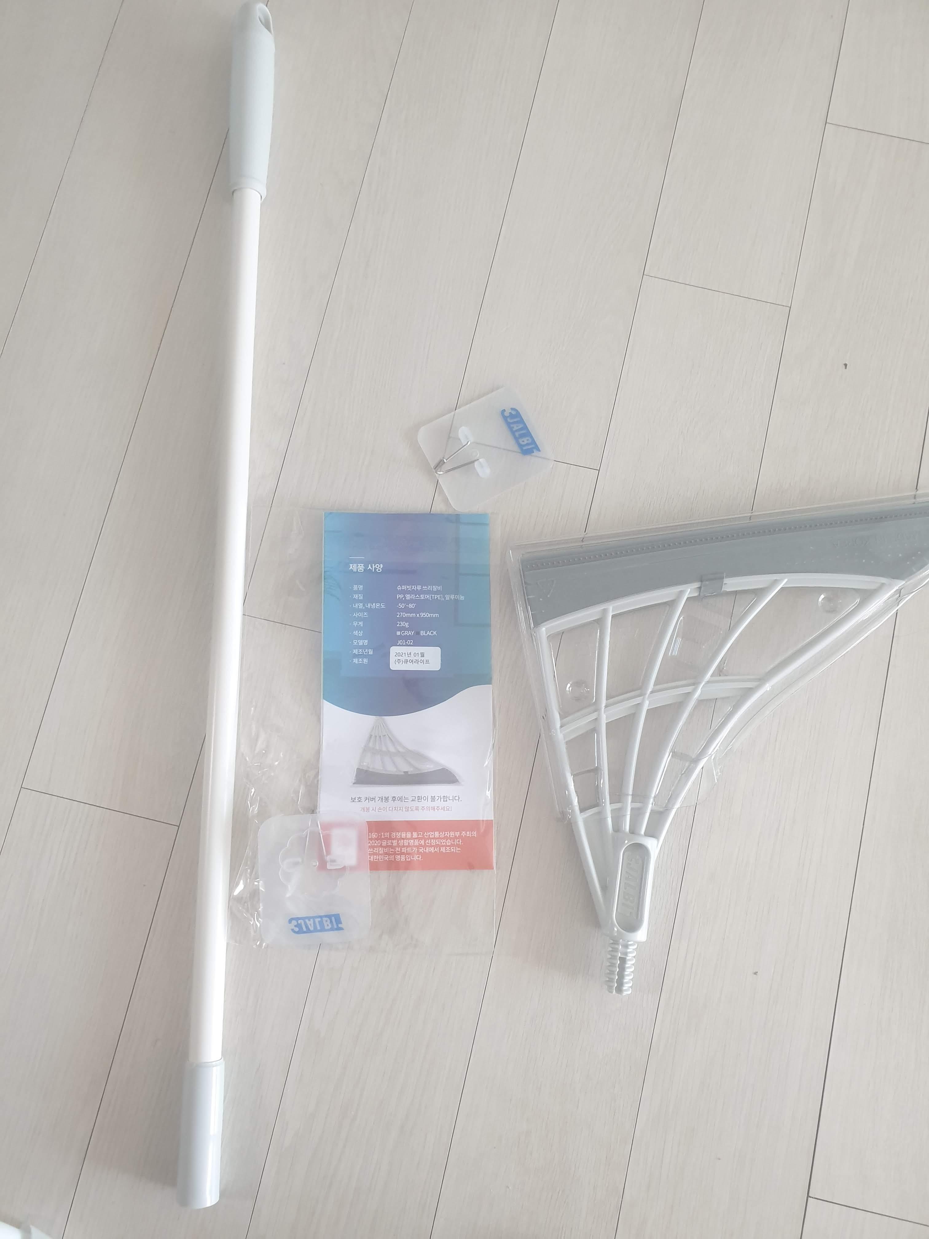 쓰리 잘비 방 빗자루는 이렇게 분리되어 배송이 됩니다. 실리콘 빗자루와 저 손잡이를 조립만 해주면 돼요. 아주 초 간단합니다.