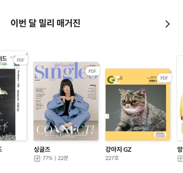매거진도 볼 수 있었어요! 와.. 이건 정말 너무 좋네요. 저는 평소 잡지 보는 걸 좋아하거든요. 그런데 잡지는 매달 사기도 돈이 아깝고, 요즘에 잡지책, 만화책 대여해주는 곳도 없어졌기 때문에 안 본 지 꽤 됐어요. 밀리의 서재에 매거진도 있으니 자주 볼 수 있을 것 같아요.