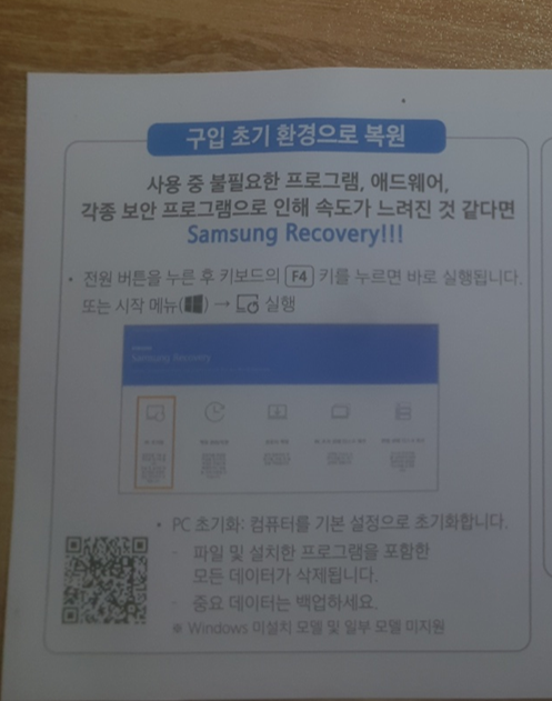 사용 설명서에 노트북 포맷하는 방법도 나와있습니다. 노트북에 설치된 Samsung Recovery 프로그램을 통해 간단하게 포맷이 가능하더라고요. 삼성 서비스 직원분 말로는 예전처럼 USB 등으로 포맷하고 윈도우 깔면 안 된다고 하더라고요.. 암튼.. 여러모로 편리해진 점이 많네요..