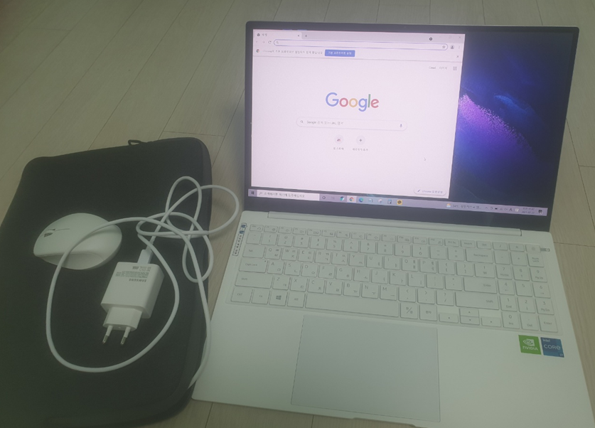 구성품은 이렇게 노트북, 충전기, 무선 마우스, 파우치 들어 있어요.
