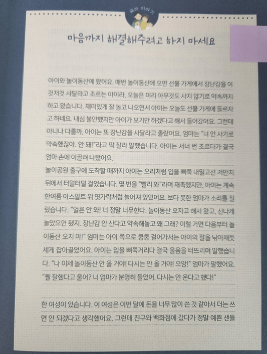 아이가 말도 안 되는 걸로 짜증내고 화내고 떼쓰는 모습을 보면 참 참기 힘들 때가 많은데... 아이가 스스로 감정을 조절할 수 있도록 인내심을 가지고 지켜봐 주어야겠어요.