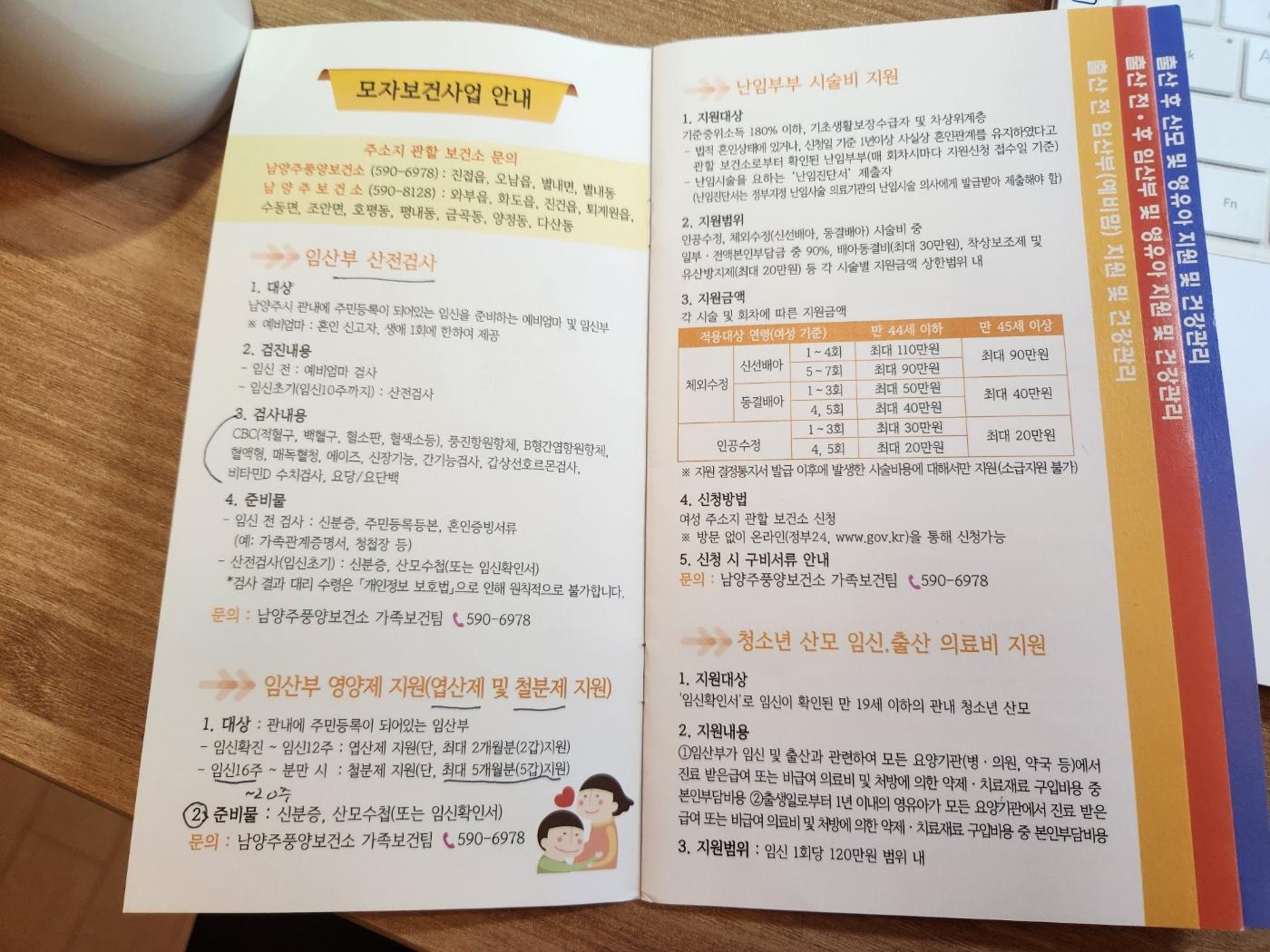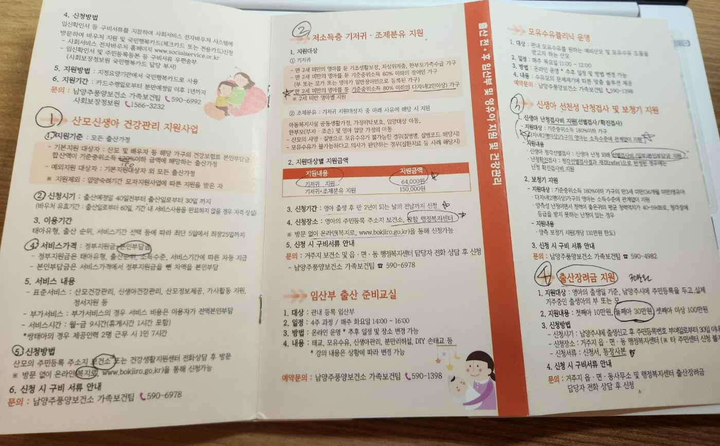 임신 출산 혜택 및 지원금 등은 지역마다 달라요. 각 지역의 보건소에 가서 임산부 등록을 하며 팜플랫 등을 받아오거나 설명을 들어 보시면 됩니다. 전국적으로 다 해당되는 지원금도 있고, 경기도에서 지원해 주는 혜택도 있고, 또 남양주시에서 주는 혜택, 그리고 남양주시 내에서도 각 지역별로 출산 장려금이 따로 있으니 자세히 알아보세요!