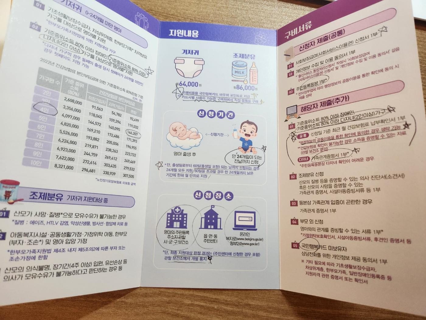 만 2세 미만의 영아를 둔 기준중위 소득 80%이하의 다자녀(2인이상) 가구의 경우 기저귀값 월 64,000원도 지원받을 수 있습니다. 보건소 또는 행정복지센터 또는 온라인(복지로)을 통해 신청 가능합니다. 가구수가 많을수록 기준중위 소득 금액도 높아지기 때문에 다자녀 가족의 경우 해당사항이 있는지 체크해 보셔서 지원받으시면 좋을 것 같아요.