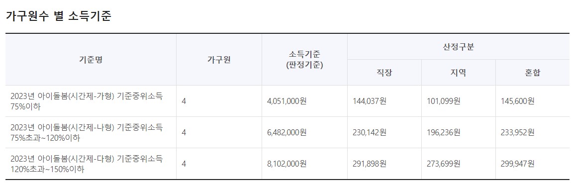 아이돌봄서비스 소득 유형 (가형, 나형, 다형, 라형)
