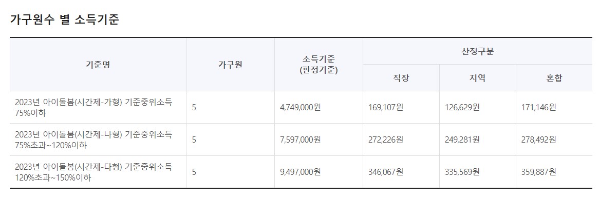 - 아이돌봄서비스 소득 유형 (가구 5인 기준 예. 부모, 아이3명)