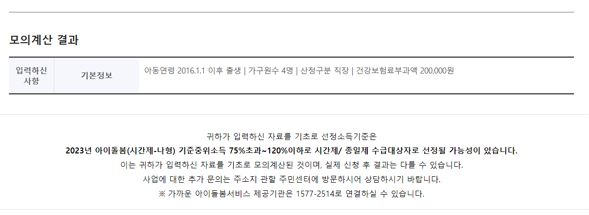 아동연령, 가구원수, 가구원의 의료보험 월 금액 정보만 있으면 간단하게 결과를 확인할 수 있습니다.