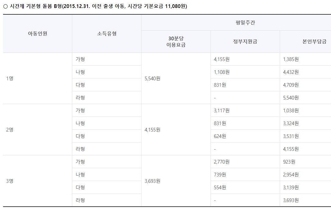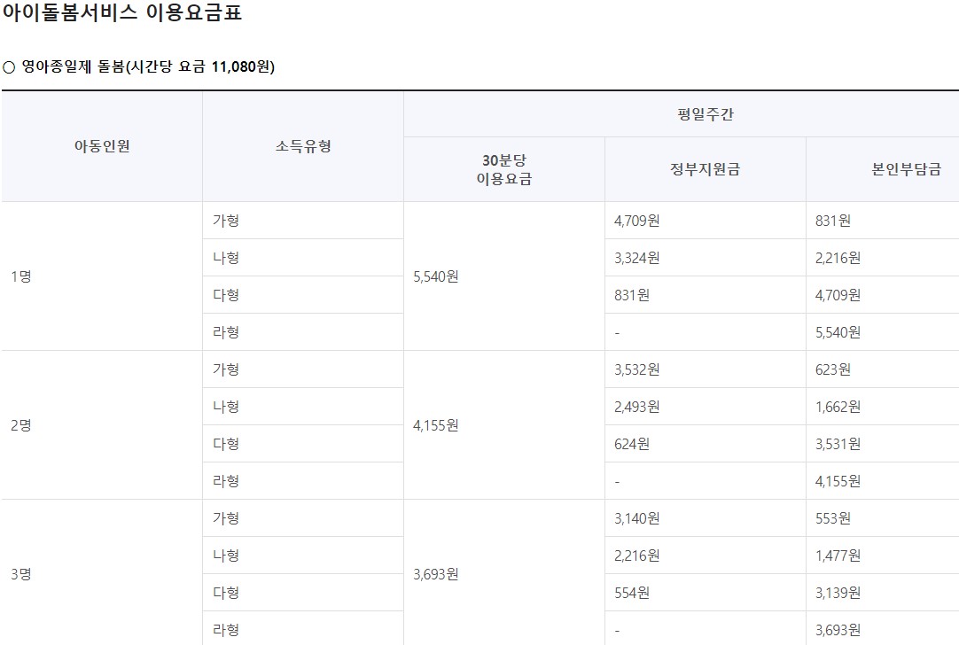시간제 유형을 이용할 경우 '가'형 소득구간이라면 1시간에 831원, '나형'은 2216원, '다'형은 4709원, 라형은 5540원(전액)을 내면 아이돌봄 서비스를 이용할 수 있어요.