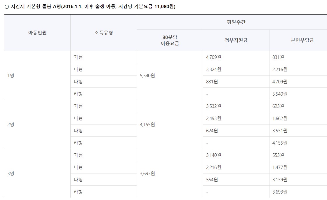 아이돌봄 서비스 가형, 나형, 다형, 라형 지원 금액
