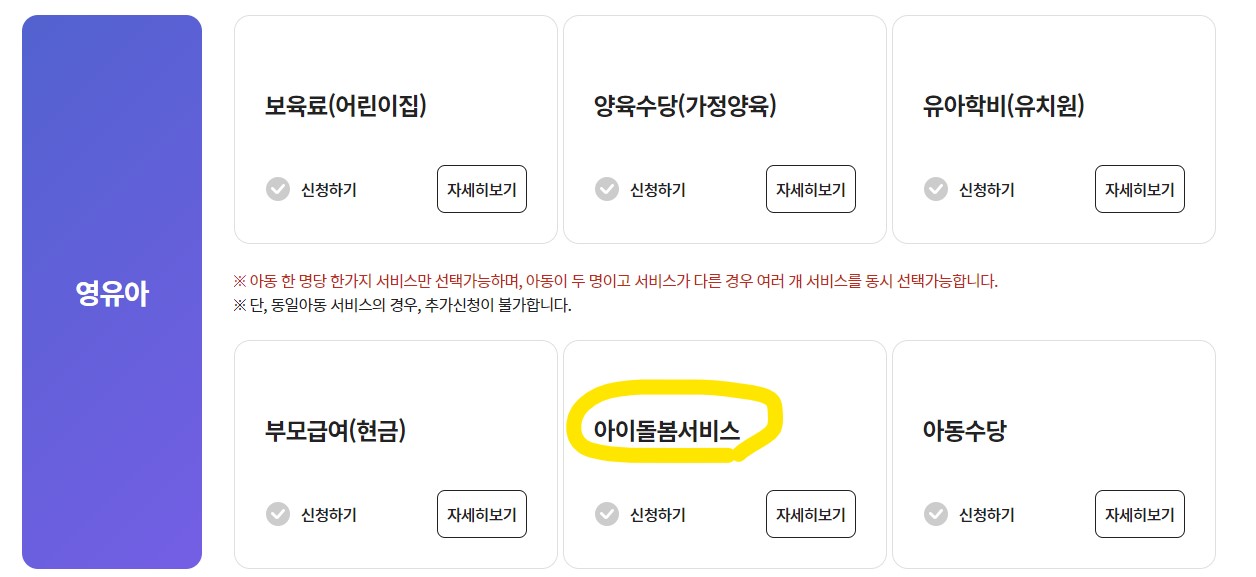 그리고아이돌봄 서비스를 받게 되면 보육료, 유아학비, 가정 양육 수당은 중복 지원되지 않습니다.