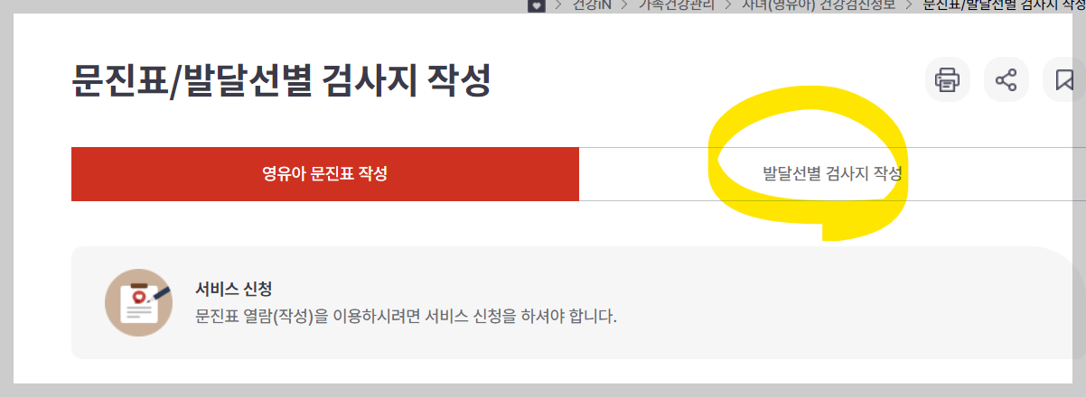 - 영유아문진표작성 옆에 있는 [발달선별 검사지 작성] 을 클릭합니다.