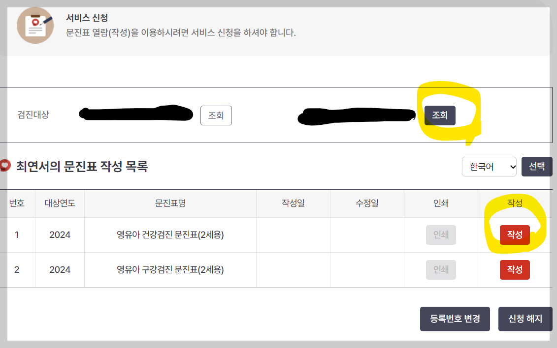 - 아이 이름 옆에 있는 [조회]를 누르고, [작성]을 눌러 작성하면 됩니다.