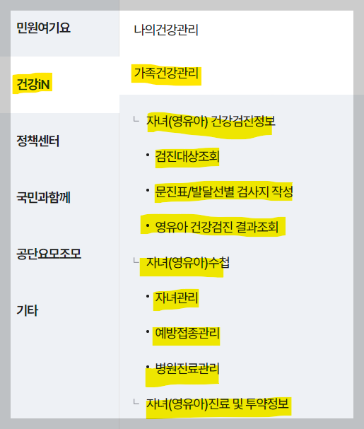 - [전체메뉴]를 클릭 한후, [건강in]을 클릭하면 [가족건강관리] 에서 자녀 건강검진 정보, 검진대상조회, 문진표/발달선별검시지 등을 작성할수 있습니다.