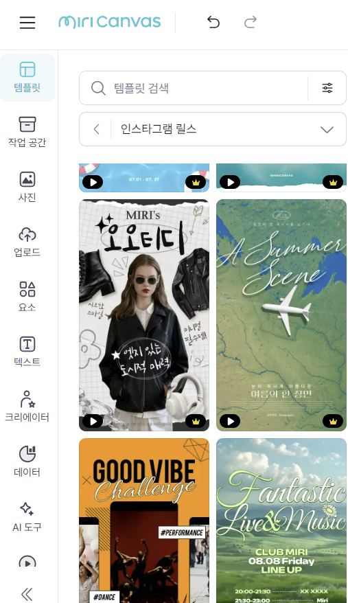 유튜브, 인스타그램, 페이스북, 틱톡 용 영상이 사이즈에 맞게, 용도에 맞게 템플릿이 많이 있으니 편리하게 사용이 가능해요.