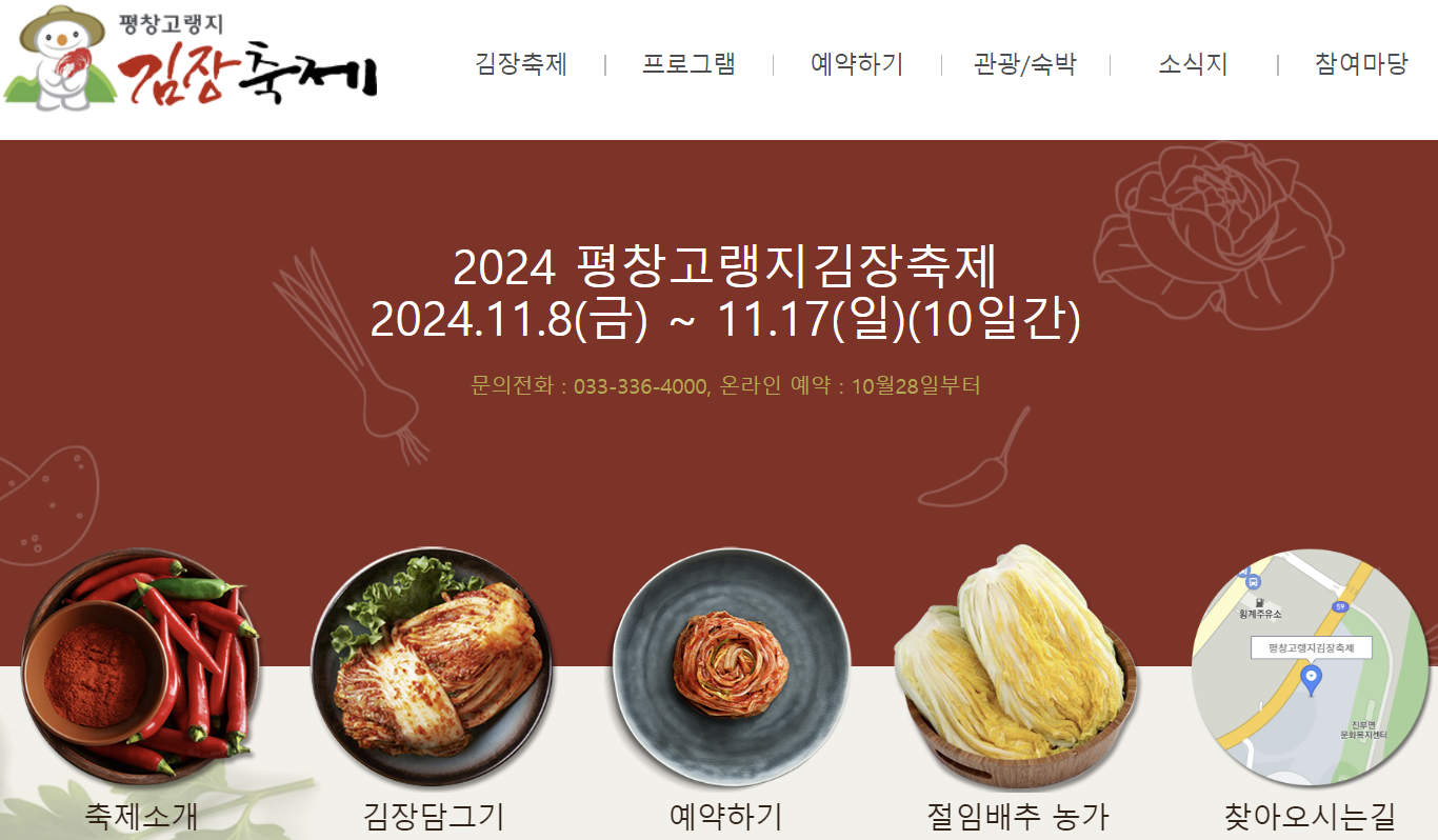평장고랭지김장축재가 11월 8일~ 17일까지 진행됩니다. 평창 고랭지 김장축제는 매년 인기 축제인데요. 그 이유가 평창 고랭지에서 재배된 배추로 직접 손쉽게 김치를 담글 수 있어서입니다. 국내산 신선한 재료로 김장을 할 수 있다는 점이 가장 큰 인기 요인입니다.
