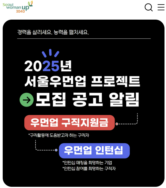 서울시에서는 창업, 취업을 준비하고 있는 여성 구직자에게 우먼업 구직지원금을 30만원, 3개월 지원합니다.