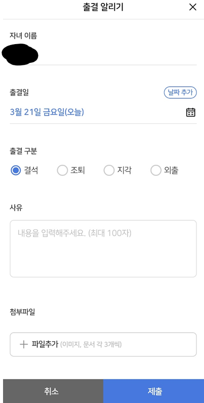 - 출결일, 구분(결석,조퇴,지각,외출) 사유, 첨부파일을 넣어주고 제출을 눌러주면 됩니다.