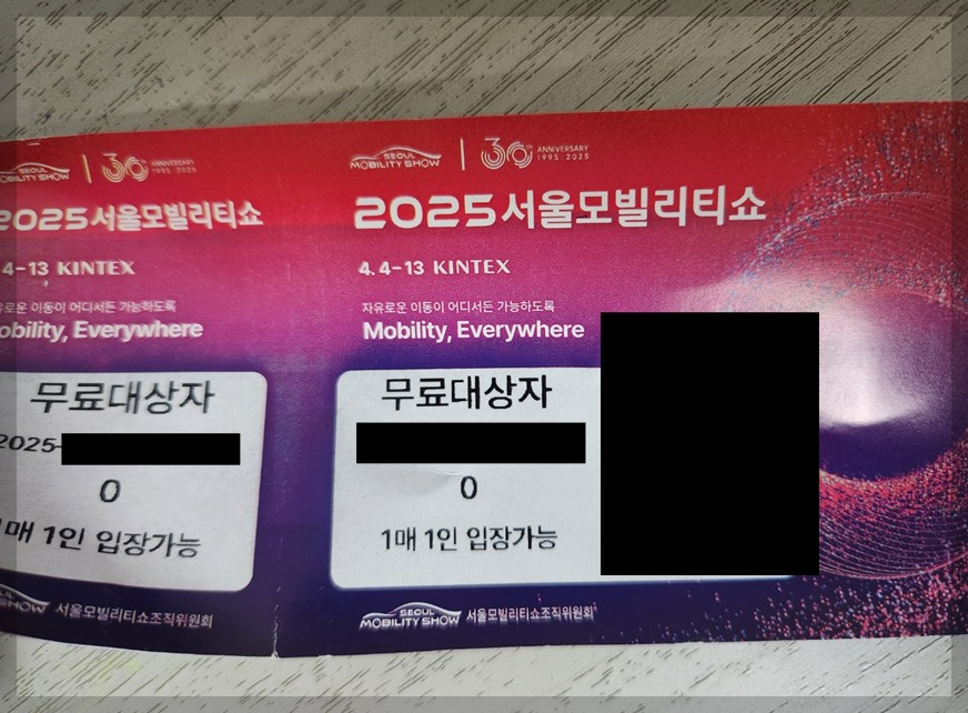 서울모빌리티쇼 티켓 성인 및 학생용은 카카오톡 모바일로 발행해주며, 미취학 아동의 무료 티켓은 종이로 발급해 주었습니다.