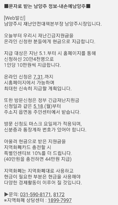 정부에서도 재난 지원금을 주지만 남양주시에서도 재난 긴급 지원금을 준다. 친절하게 문자로 알려주기 때문에 따로 정보를 찾아볼 필요 없이 조용히 문자를 기다리면 된다. 남양주시에서 아래와 같은 문자가 왔다.