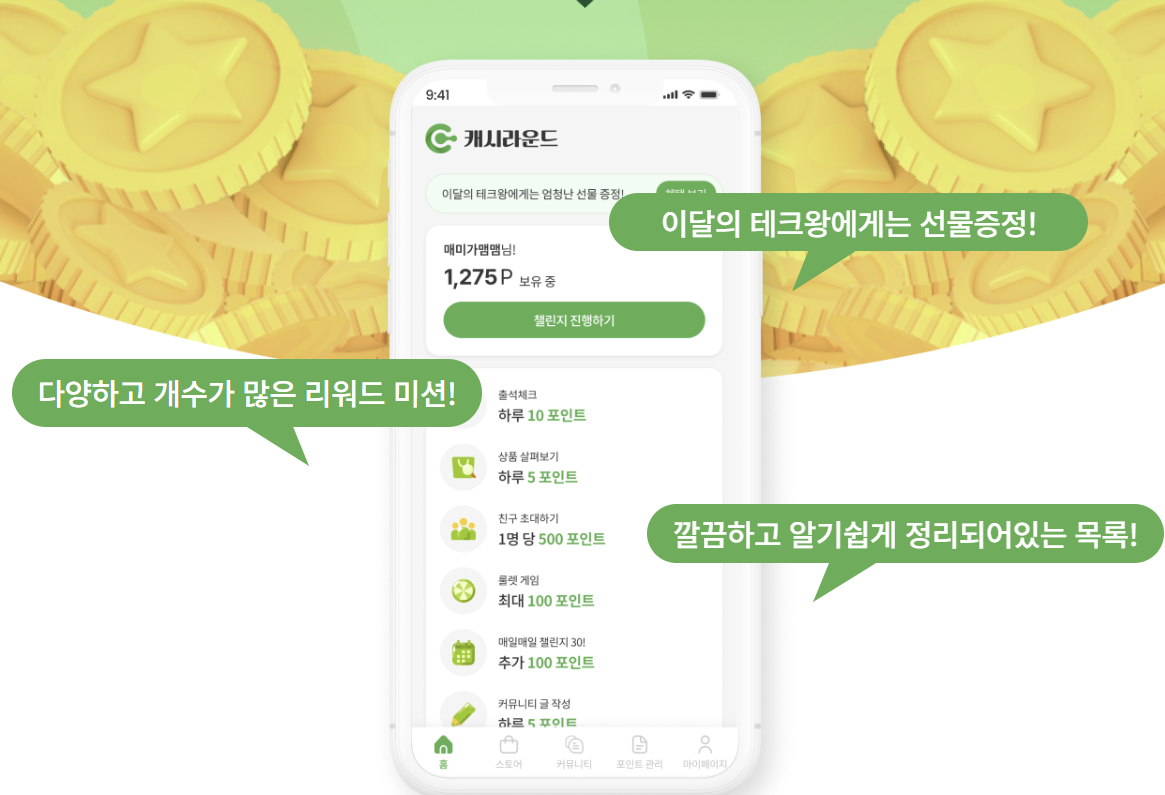 앱테크 cashround는 광고 시청, 간단한 미션 참여, 출석 체크 등을 통해 포인트를 적립하고 이를 현금이나 기프티콘으로 교환할 수 있는 앱테크 플랫폼입니다. 기존의 포인트 적립 앱들이 단순히 리워드를 쌓는 것에 집중했다면, cashround는 사용자가 일상 속에서 부담 없이 참여할 수 있는 다양한 콘텐츠를 제공해 재미 요소까지 챙겼다는 점이 특징입니다.