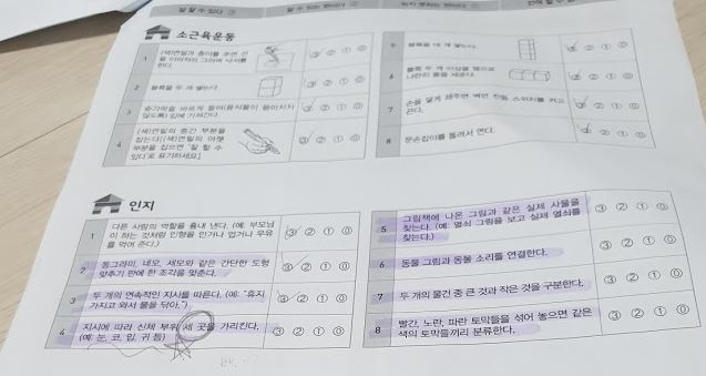 저희 아이는 가만히 앉아 있는 것을 안 좋아합니다. 그래서 놀이터에서 노는 것과 집에서 엄마 아빠와 술래잡기하는 등의 몸으로 하는 놀이를 많이 했어요. 그러다 보니 대근육, 소근육, 사회성, 자조 등의 부분에서는 모두 잘하는 것으로 나왔어요. 하지만 인지, 언어 부분은 못 하는 항목이 많았습니다. 못 한다기보다는 집에서 안 시켜 본 것이 많았어요. 그래서 이번 선별검사표를 통해 인지, 언어 부분의 발달이 더딘 것을 알고 그 부분을 발달시킬 수 있도록 노력하고 있어요. 열심히 말도 가르치고, 도형, 색깔, 큰 것, 작은 것 구분하기, 지시하기 등을 하고 있어요.