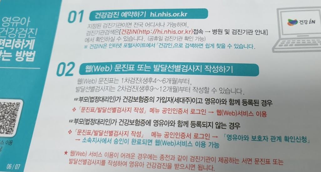 이번 경험을 통해서 왜 주변에서 영유아 건강검진은 최대한 늦게 받는 게 좋다고 하는지 알게 되었어요. 너무 일찍 받게 되면 못하는 항목이 꽤 많을 수 있기 때문인데요. 못 하는 항목이 많을수록 발달이 안 좋다는 결과가 나올 수 있어요. 저는 이번 계기를 통해서 영유아 건강 검진 문진표와 발달 선별 검사표를 미리 다운로드하여서 체크해본 다음 잘 안되고 있는 부분은 좀 더 발달시킬 수 있도록 하고 있습니다.