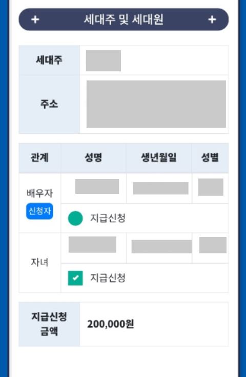약관 동의 > 주민등록지 시군 선택 > 카드 선택 및 카드 번호 입력> ARS 인증 > 신청자 본인 정보 확인 > 관할 주민 센터 및 세대주 확인 > 세대주 및 세대원 (여기서 자녀가 뜨면 함께 지급 신청을 체크해준다) > 신청정보 확인 > 신청 완료
