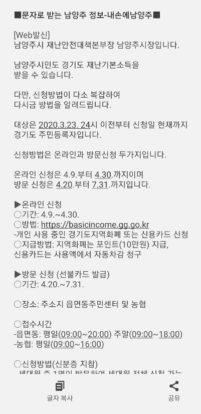 문자로 코로나 관련 소식에 계속 날아온다. 그중 지원금 소식이 참 반갑다. '재난 긴급 지원금' 소식과 '재난 기본 소득' 두 가지 지원금 문자가 왔다. 재난 긴급 지원금 관련으로 신청 방법은 아직 알려주지 않았다. 하지만 4월 9일부터 신청할 수 있는 '재난 기본 소득'은 스마트폰으로 아주 간단하게 신청할 수 있었다. 자녀 지원금도 한 번에 신청이 가능하다. (하지만 배우자의 지원금은 배우자가 직접 해야 한다..) 본인 명의 및 핸드폰으로 등록된 신용카드가 있으면 된다! 자세한 신청 방법은 문자로 아주 자세히 안내를 해준다.