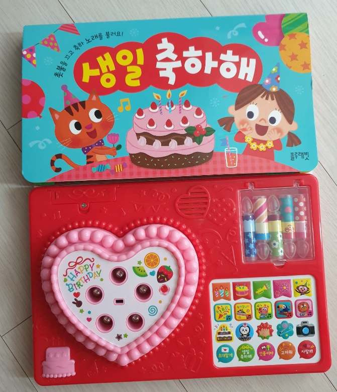 이 뽀로로 장난감 말고 <생일 축하해>라는 책도 샀었어요. 책이랑 친해지길 바라는 마음에 생일 관련 책을 산 건데, 책에 붙어있는 케이크 장난감을 더 좋아합니다. 사실 책 내용은 하나도 안 봐요. 베터리 수명도 꽤 오래가고 (지금까지 한 번도 안 갈아줬어요) 고장도 한 번도 안 났습니다.