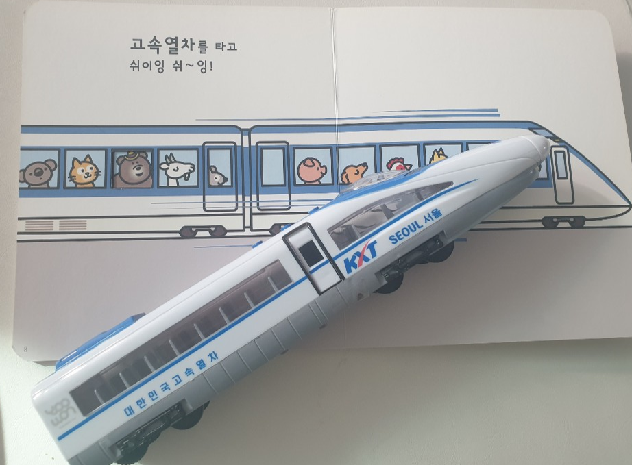 저희 아이가 가장 놓아하는 타고 또 타고라는 푸름이까꿍 그림책입니다. 여기에 나오는 교통수단의 각 장난감들을 모아서 책에 대입해보는 건데요. 마침 근처 문방구에 KTX 고속열차고 있어 사주었습니다. 비행기, 버스, 기차, 고속열차, 배, 자전거 등이 나옵니다.