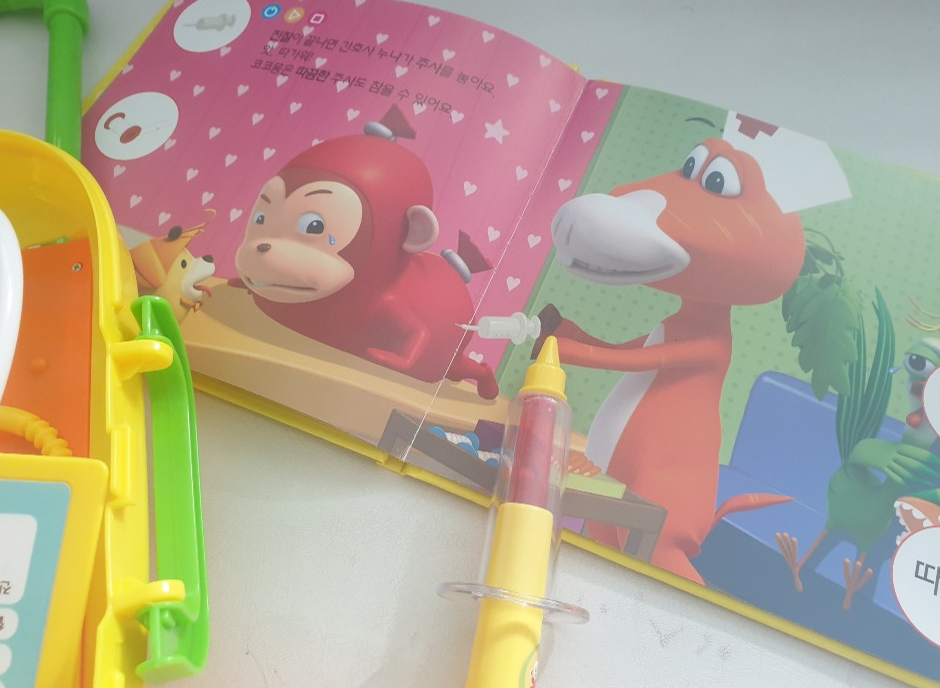병원 놀이 장난감으로 아빠, 엄마를 상대로 의사, 환자가 되어 자주 놀았었는데요. 이번에는 코코몽의 병원이 아기 나오는 책을 보며 같이 놀아봤어요. 각 장면 별로 의사, 간호사 선생님이 되어 따라 해 주었어요. 이 장은 코코멍 엉덩이에 주사를 놔주는 장면이에요. 실제 장난감 주사기로 책의 코코몽 엉덩이에 주사도 놔주고 체온도 재고, 진찰도 해주었답니다.