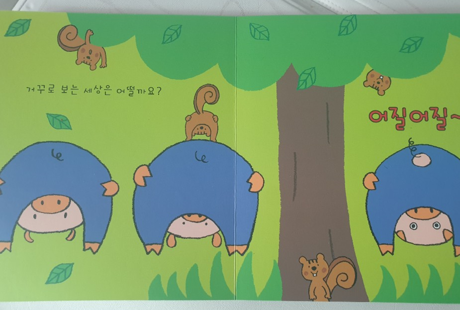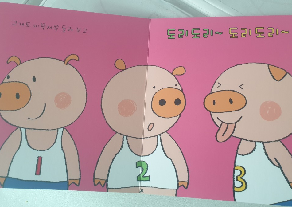 아기 돼지들이 체조하는 내용의 책이에요. 그림에 나오는 체조를 같이 따라 하고 놀면 까르르 웃고 좋아합니다. 특히 아래 거꾸로 고개를 박고 가랑이 사이로 얼굴을 내미는 체조를 좋아합니다. 도리도리 체조에서는 세 번째 되재 메롱을 꼭 따라 하면서 좋아해요.