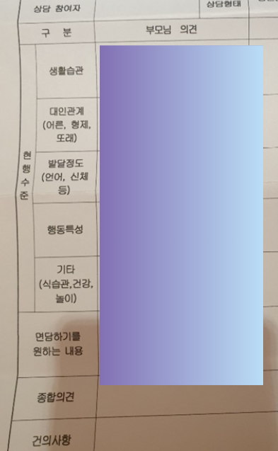 생활습관에는 밥을 잘 먹는지 잠잘 때는 어떻게 자는지 등 평소 집에서의 생활을 적었어요. 저는 무난하게 밥도 잘 먹고, 양치도 잘한다고 적고, 잠은 진짜 안 자려고 한다고 적었습니다. 이 글을 보시더니, 상담 중에 선생님께서 잠 잘자게 하는 방법이나 팁도 주셨어요.
