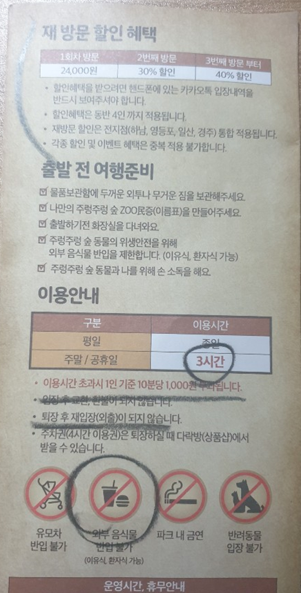 평일은 상관없지만 주말/공휴일은 3시간만 이용할 수 있습니다. 저희는 중간에 카페에서 피자랑 커피도 마시고 키즈카페에서도 놀고 동물원도 천천히 다 돌았는데 시간 2시간 30분 정도 걸리더라고요. 그래서 3시간으로 충분히 잘 놀다 왔습니다.