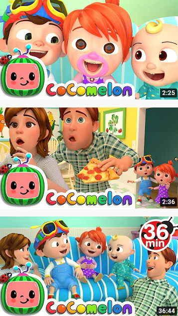 저희 아이가 정말 좋아하는 영상이에요. 특히 밤에 가족들이 몰래 과자, 젤리, 사탕을 먹고 하하하 하고 웃는 영상 보면서 하하하 웃는 것을 따라 하기도 해요. 주인공이 베이비 이기 때문에 감정 이입을 하면서 보는 것 같았어요.. 엄마가 아기 재우는 내용, 밥 먹기 싫어하는 내용, 목욕하기 싫어하는 내용, 숨바꼭질하는 놀이 등등 다양한 스토리가 있어요. 따라 할 만한 놀이가 있으면 따라 하기도 하고, 아이가 아는 사물이 나오면 옆에서 이거 뭐야~? 하면서 말도 시켜봅니다. 코코 멜론 영상 중에 생일 파티하는 내용이랑, 찰칵찰칵 소리 나면서 단어 가르쳐주는 영상이 있어요. (제목이.. 생각이 안 나네요) 그것도 보면서 까르르 웃습니다. 뭘 알고 웃는 건지 모르겠네요.ㅎㅎ 영어로 제작된 영상물이 많아요. 영어도 들려주면 좋을 것 같아서 영문 버전 그대로 보여주는데 한글 영상도 있더라고요~