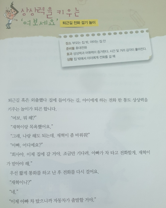 그 외에도 아빠가 퇴근길에 아이와 전화를 하면서, 아빠는 어디 어디쯤 왔어하며 전화하는 놀이가 있는데 너무 좋아 보였어요. 저희 아이가 말만 좀 트이면 아빠와 이 놀이를 시켜보고 싶어요.